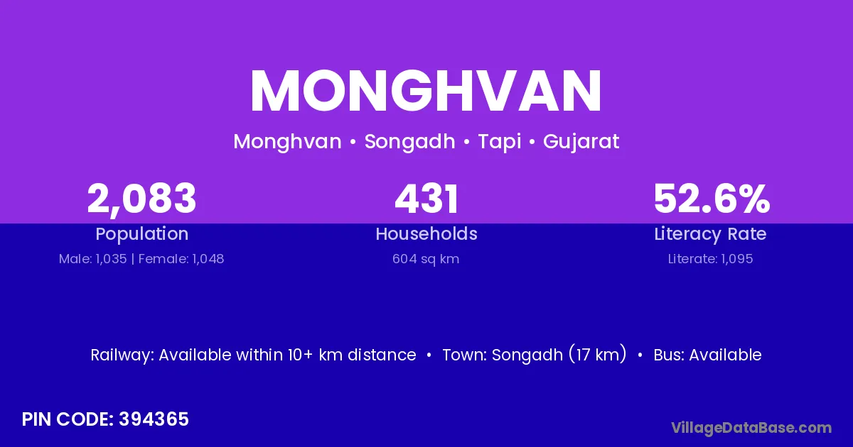 Songadh (17 km) is the nearest town to Monghvan village for major economic activities and is located approximately 17 km away.