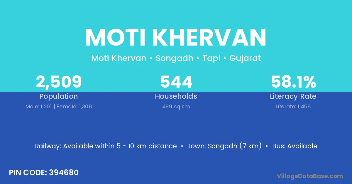 Songadh (7 km) is the nearest town to Moti Khervan village for major economic activities and is located approximately 7 km away.