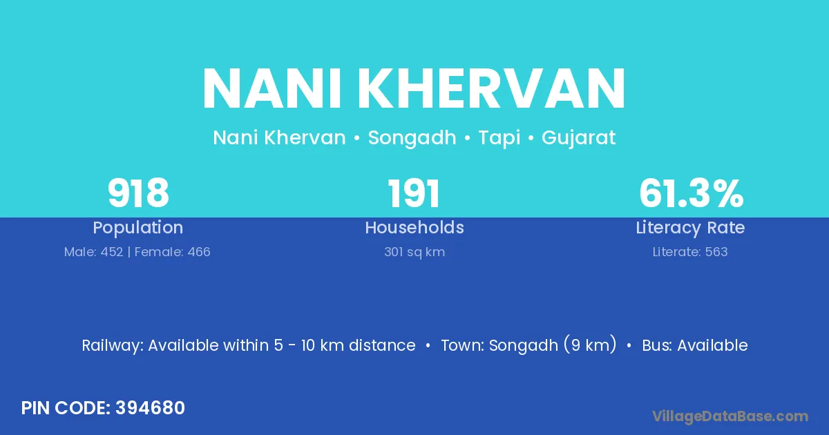 Songadh (9 km) is the nearest town to Nani Khervan village for major economic activities and is located approximately 9 km away.