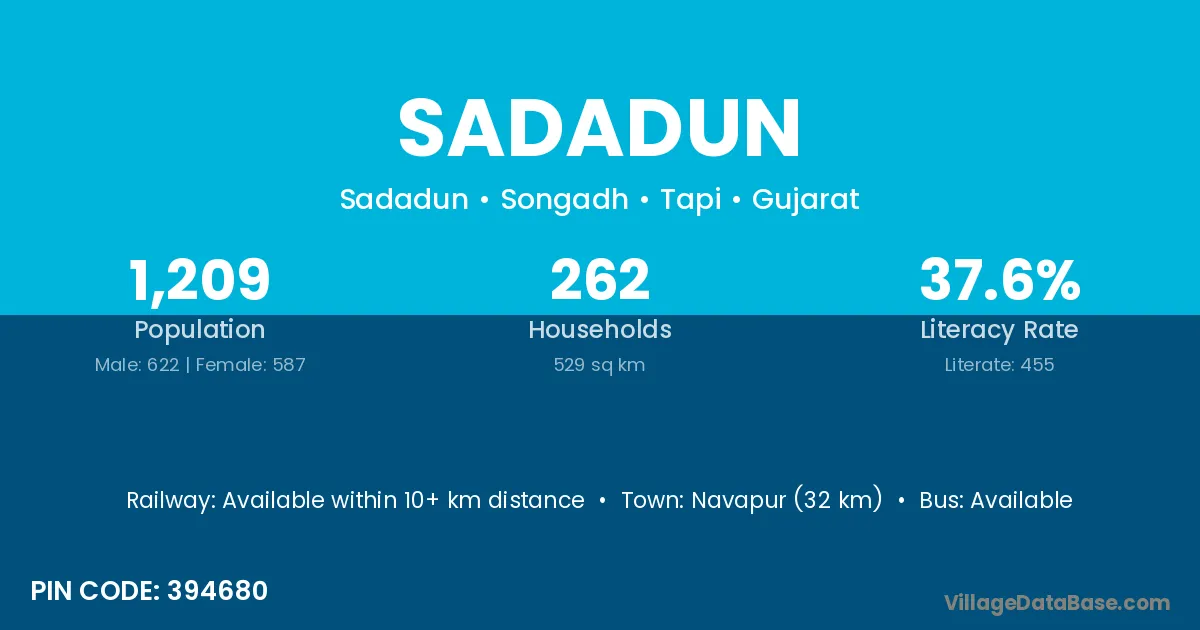 Navapur (32 km) is the nearest town to Sadadun village for major economic activities and is located approximately 32 km away.