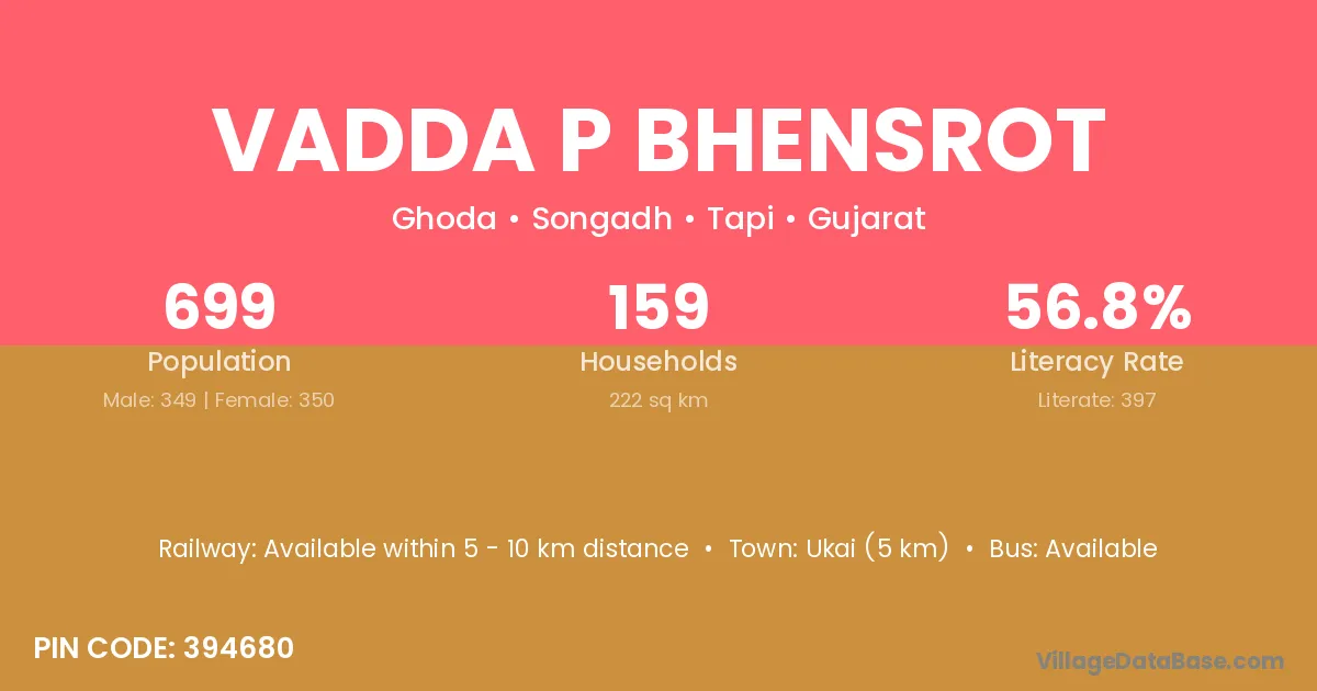 Ukai (5 km) is the nearest town to Vadda P Bhensrot village for major economic activities and is located approximately 5 km away.