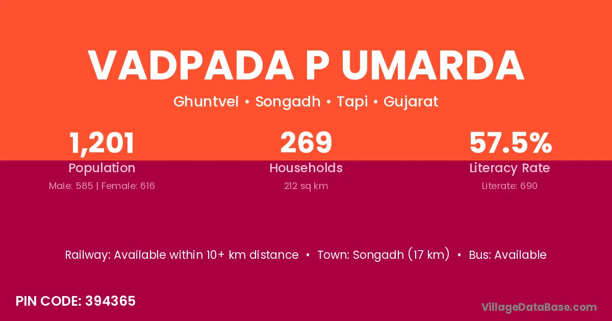 Vadpada P Umarda village has a total population of 1,201 people, of which 585 are males and 616 are females.