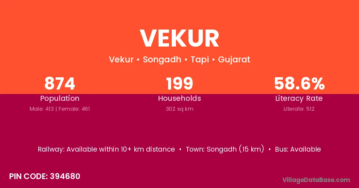 Songadh (15 km) is the nearest town to Vekur village for major economic activities and is located approximately 15 km away.