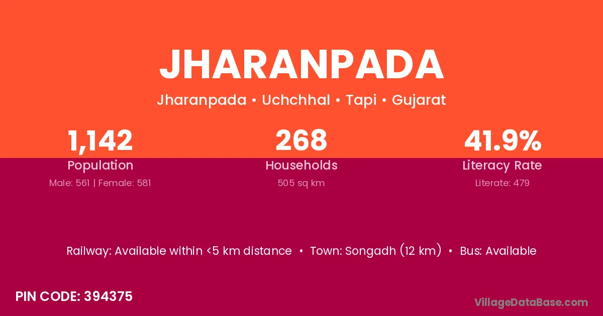 Songadh (12 km) is the nearest town to Jharanpada village for major economic activities and is located approximately 12 km away.