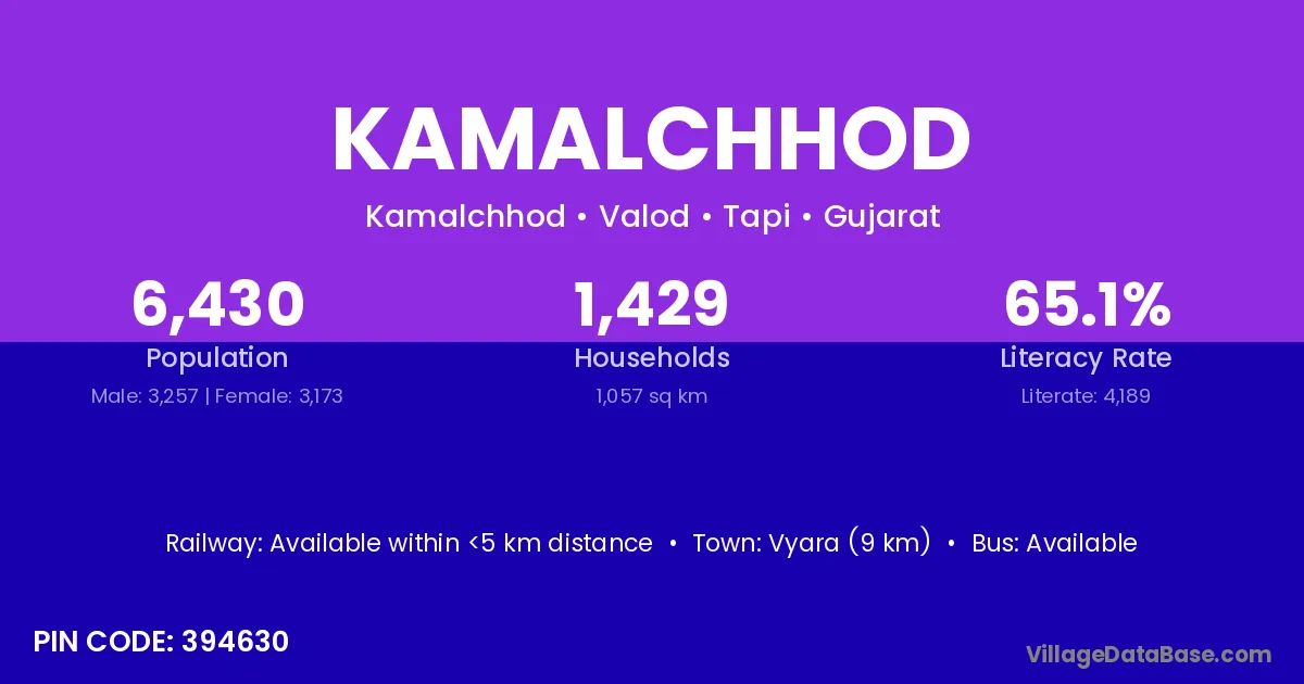 Vyara (9 km) is the nearest town to Kamalchhod village for major economic activities and is located approximately 9 km away.