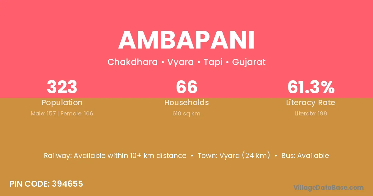 Vyara (24 km) is the nearest town to Ambapani village for major economic activities and is located approximately 24 km away.