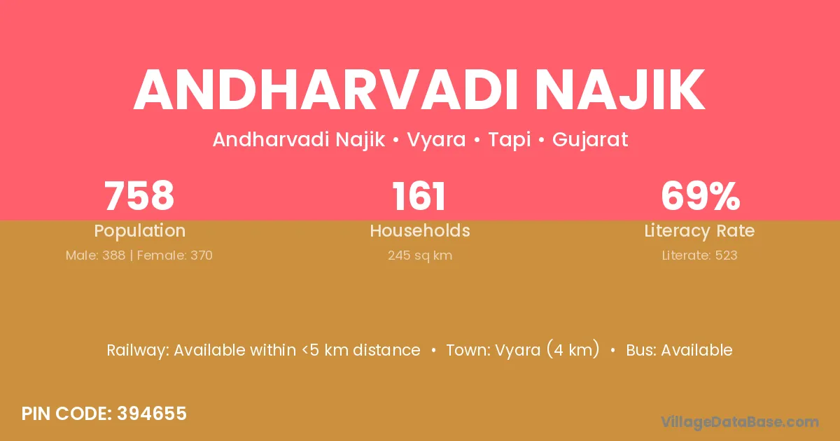 Vyara (4 km) is the nearest town to Andharvadi Najik village for major economic activities and is located approximately 4 km away.