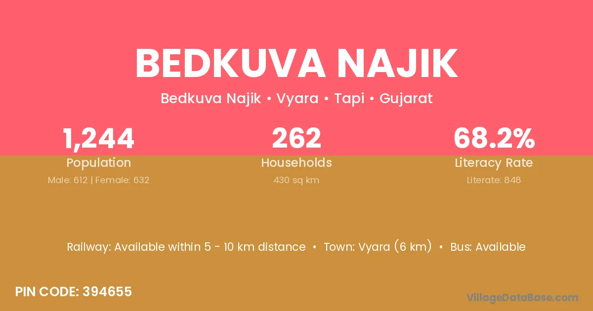 Vyara (6 km) is the nearest town to Bedkuva Najik village for major economic activities and is located approximately 6 km away.