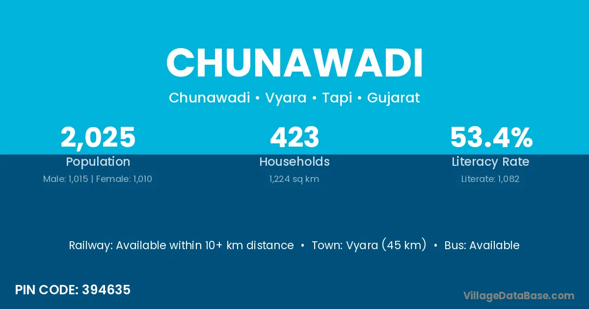 Vyara (45 km) is the nearest town to Chunawadi village for major economic activities and is located approximately 45 km away.