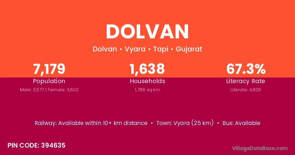 Vyara (25 km) is the nearest town to Dolvan village for major economic activities and is located approximately 25 km away.