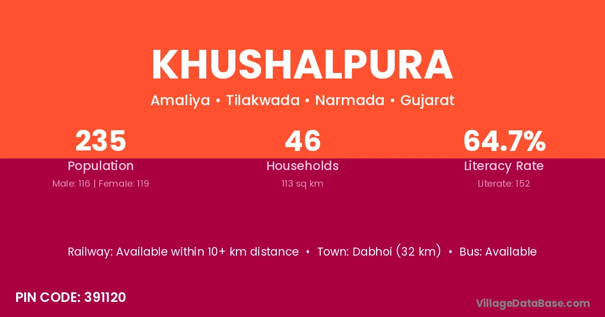 Vyara (4 km) is the nearest town to Khushalpura village for major economic activities and is located approximately 4 km away.