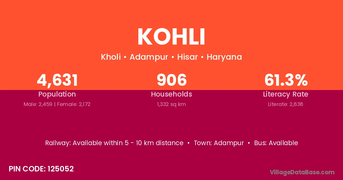 Kohli village has a total population of 1,261 people, of which 615 are males and 646 are females.