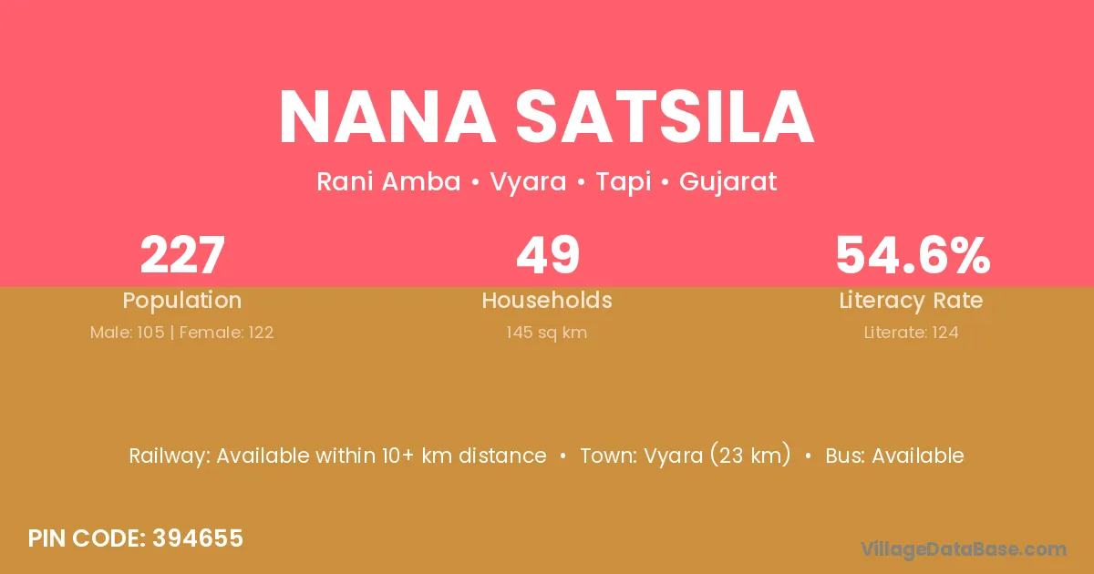 Vyara (23 km) is the nearest town to Nana Satsila village for major economic activities and is located approximately 23 km away.