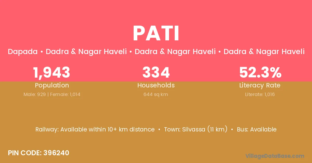 Vyara (30 km) is the nearest town to Pati village for major economic activities and is located approximately 30 km away.