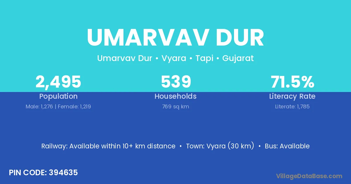 Vyara (30 km) is the nearest town to Umarvav Dur village for major economic activities and is located approximately 30 km away.