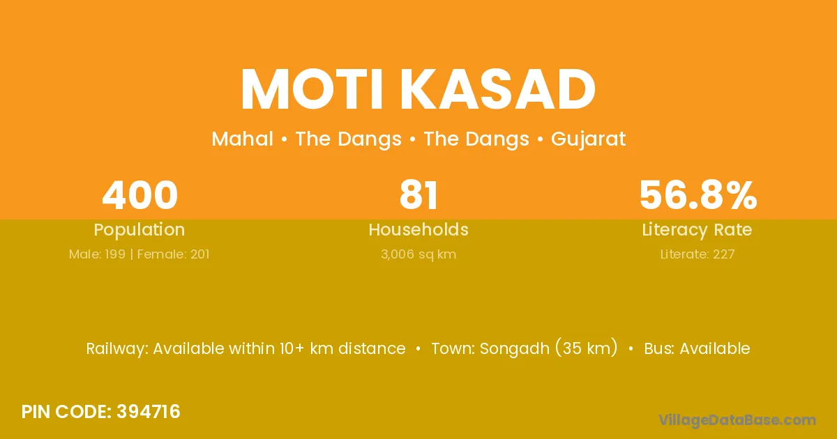 Songadh (35 km) is the nearest town to Moti Kasad village for major economic activities and is located approximately 35 km away.
