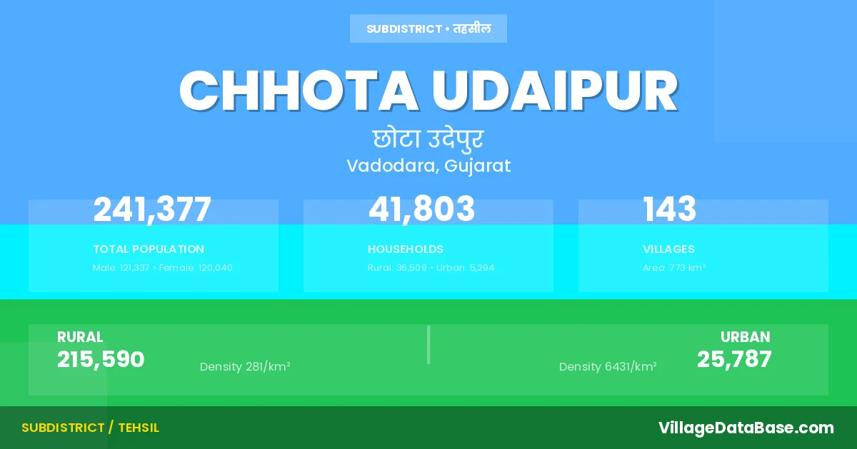 According to the 2011 census The total area of Chhota Udaipur Taluka is 773 km², with a population of 241377 people. The population density is 313 inhabitants per square kilometre, and there are approximately 41803 houses in the sub district.