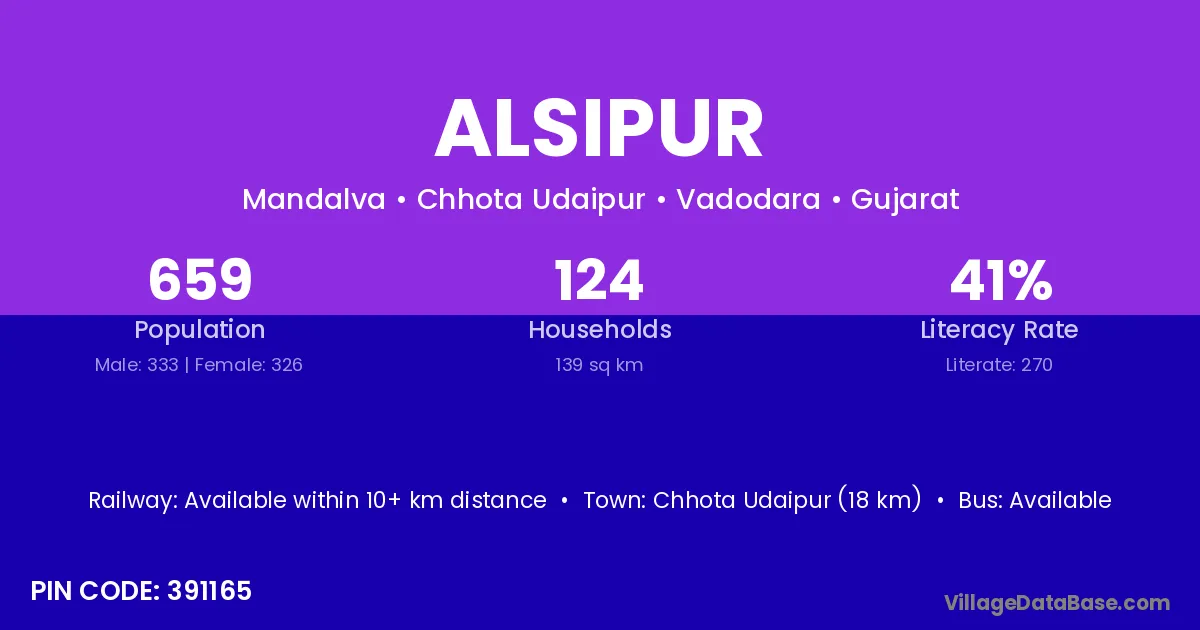 Chhota Udaipur (18 km) is the nearest town to Alsipur village for major economic activities and is located approximately 18 km away.
