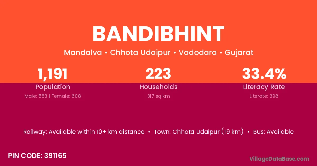 Chhota Udaipur (19 km) is the nearest town to Bandibhint village for major economic activities and is located approximately 19 km away.