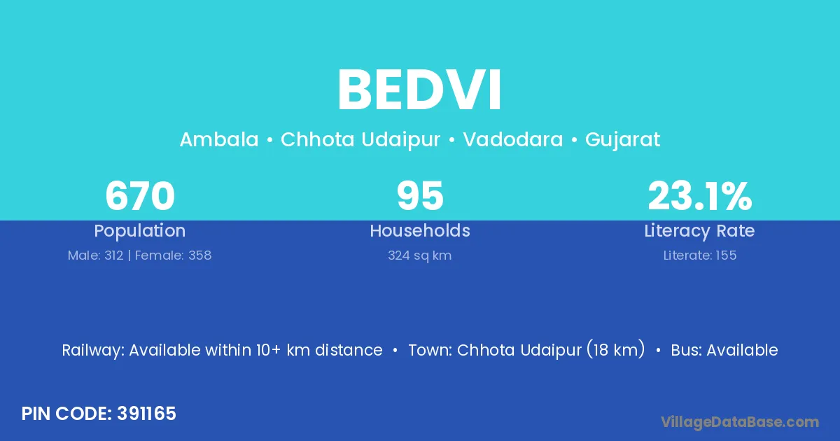 Chhota Udaipur (18 km) is the nearest town to Bedvi village for major economic activities and is located approximately 18 km away.