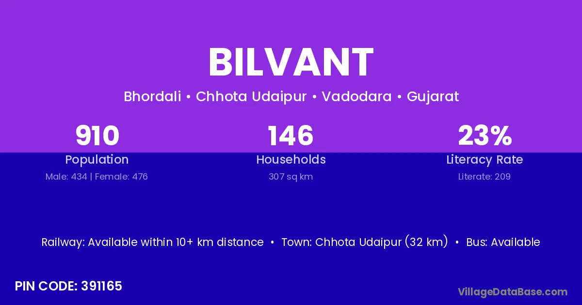 Chhota Udaipur (32 km) is the nearest town to Bilvant village for major economic activities and is located approximately 32 km away.