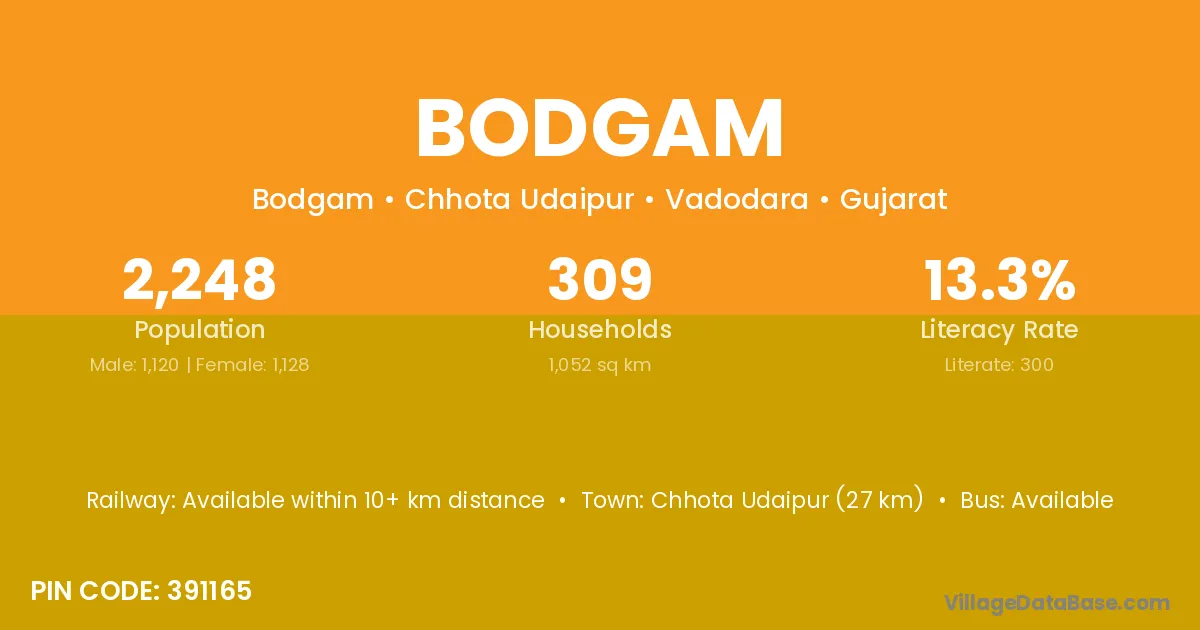 Chhota Udaipur (27 km) is the nearest town to Bodgam village for major economic activities and is located approximately 27 km away.