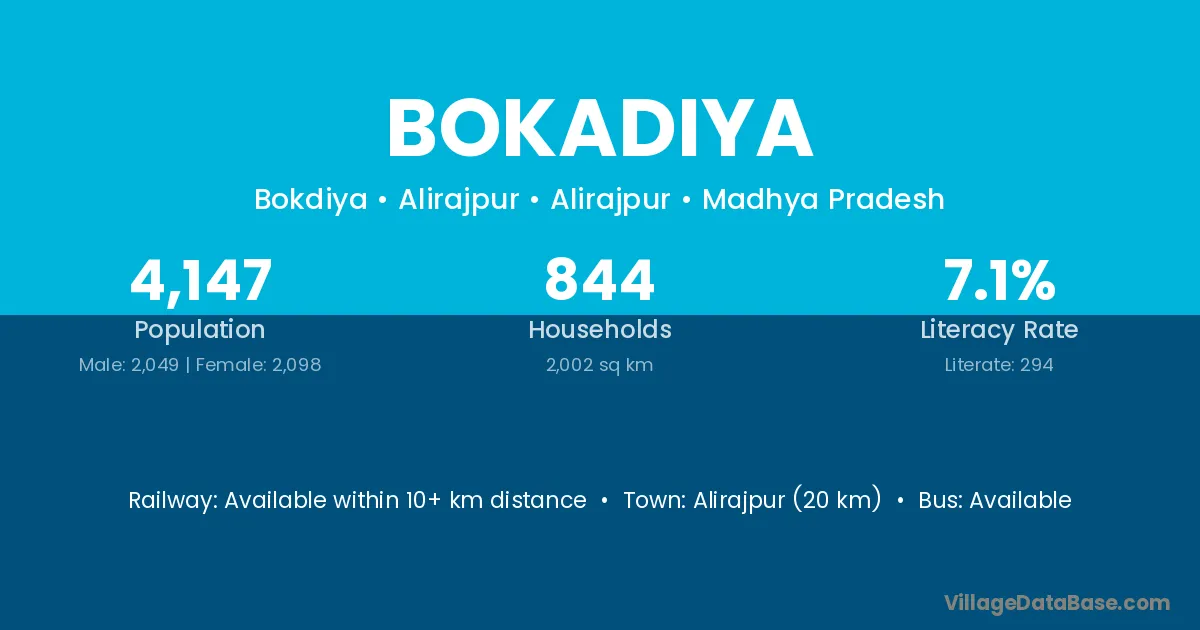 Chhota Udaipur (25 km) is the nearest town to Bokadiya village for major economic activities and is located approximately 25 km away.