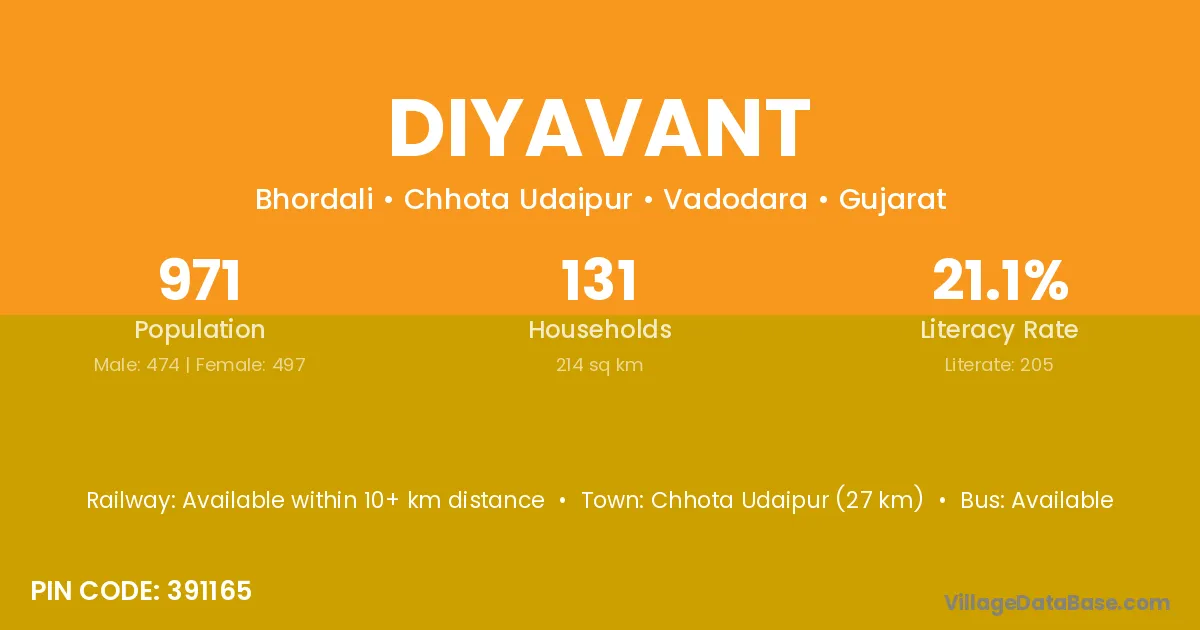 Chhota Udaipur (27 km) is the nearest town to Diyavant village for major economic activities and is located approximately 27 km away.