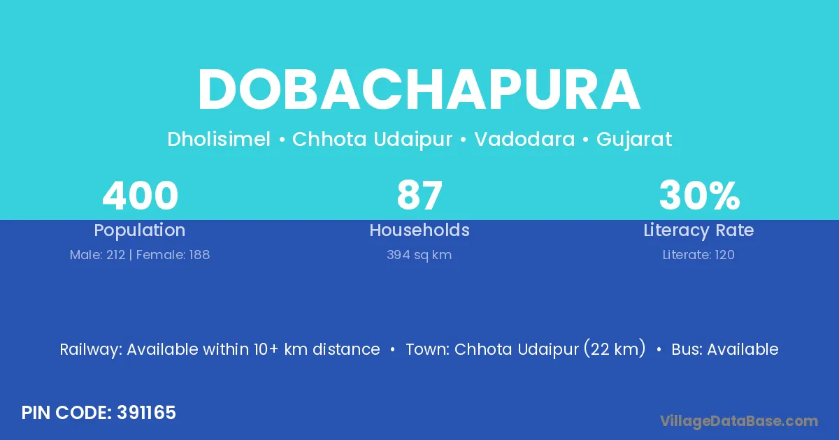 Chhota Udaipur (22 km) is the nearest town to Dobachapura village for major economic activities and is located approximately 22 km away.