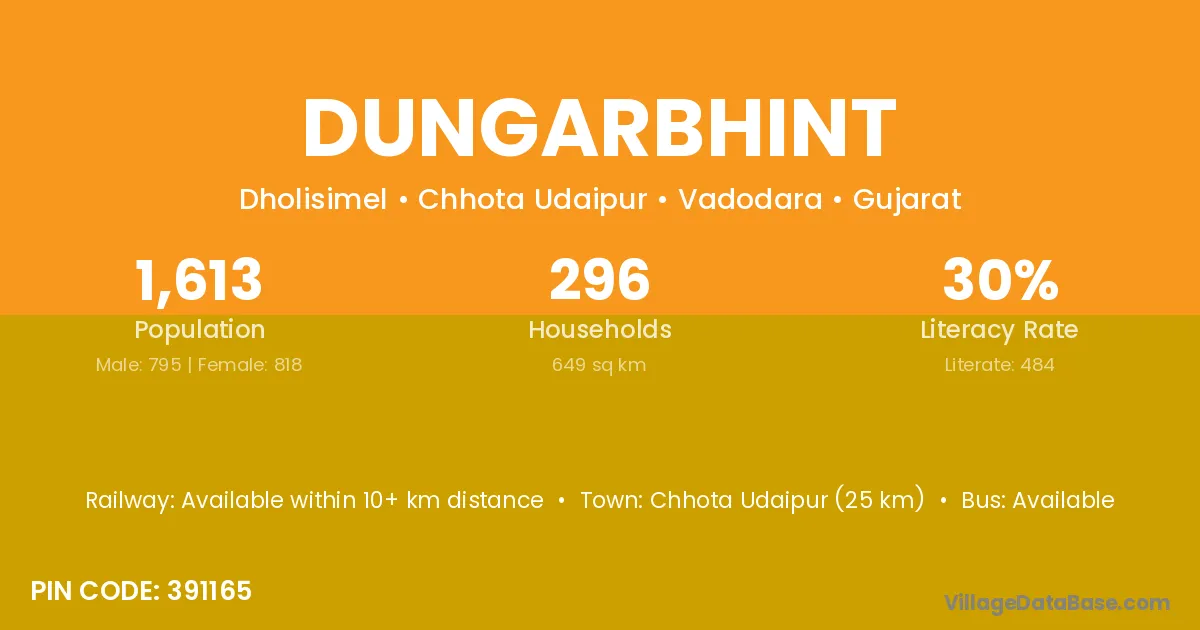 Chhota Udaipur (25 km) is the nearest town to Dungarbhint village for major economic activities and is located approximately 25 km away.
