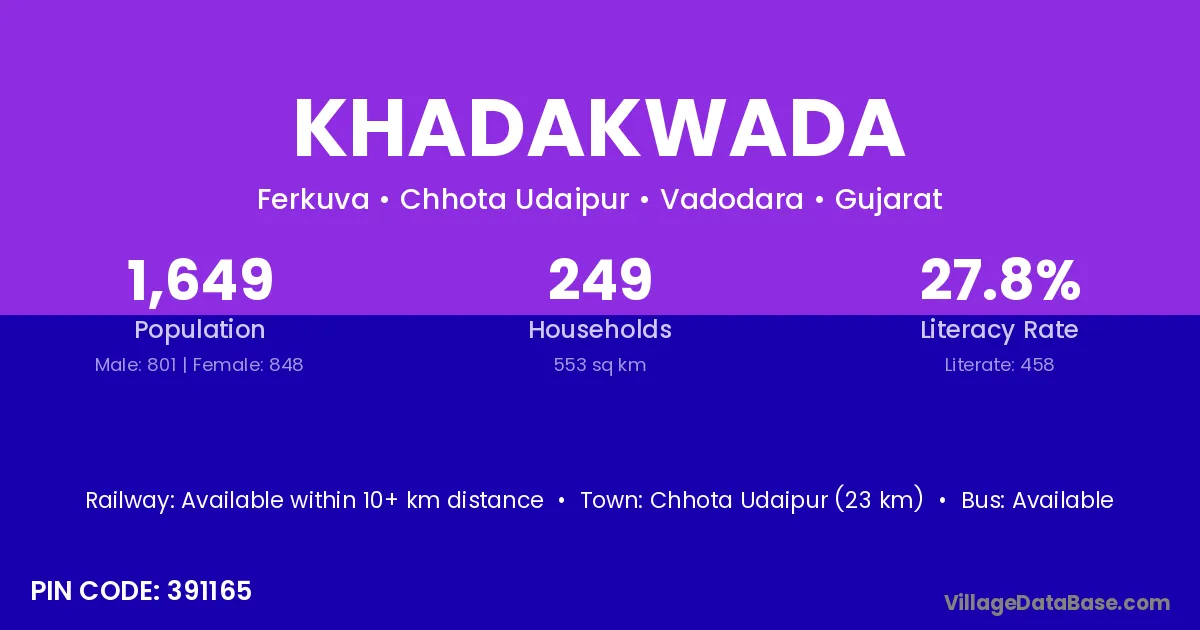 Chhota Udaipur (23 km) is the nearest town to Khadakwada village for major economic activities and is located approximately 23 km away.
