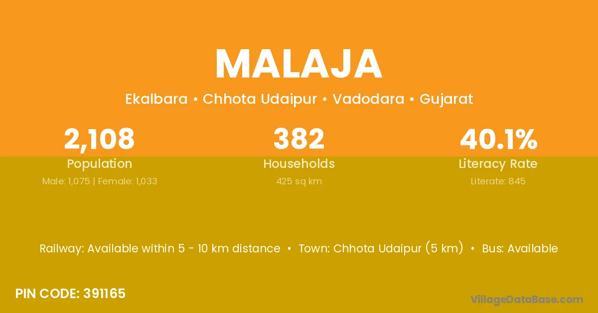Chhota Udaipur (5 km) is the nearest town to Malaja village for major economic activities and is located approximately 5 km away.