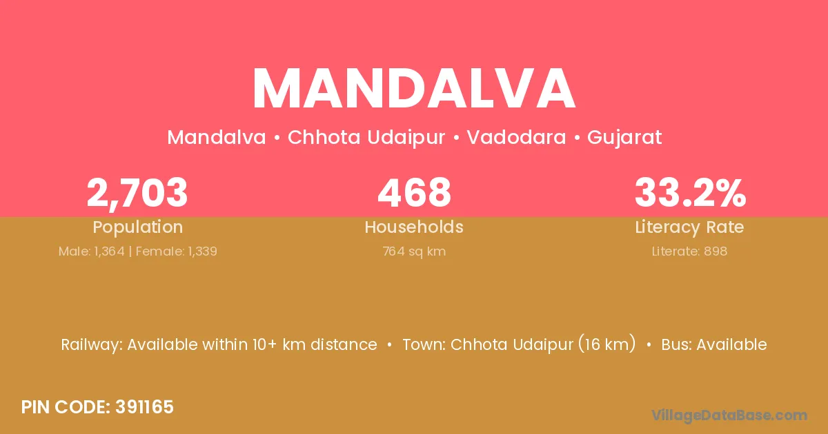 Chhota Udaipur (16 km) is the nearest town to Mandalva village for major economic activities and is located approximately 16 km away.
