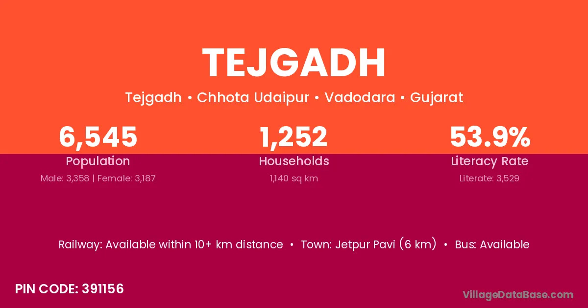 Jetpur Pavi (6 km) is the nearest town to Tejgadh village for major economic activities and is located approximately 6 km away.
