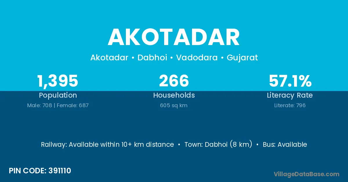 Dabhoi (8 km) is the nearest town to Akotadar village for major economic activities and is located approximately 8 km away.