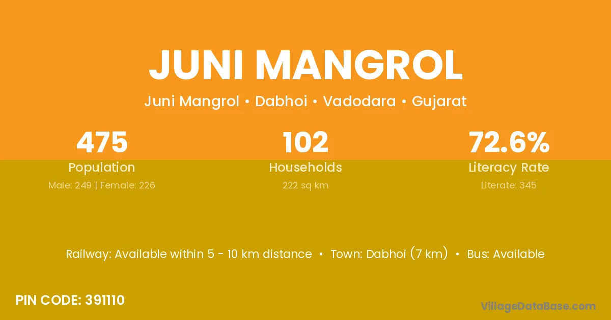Dabhoi (7 km) is the nearest town to Juni Mangrol village for major economic activities and is located approximately 7 km away.