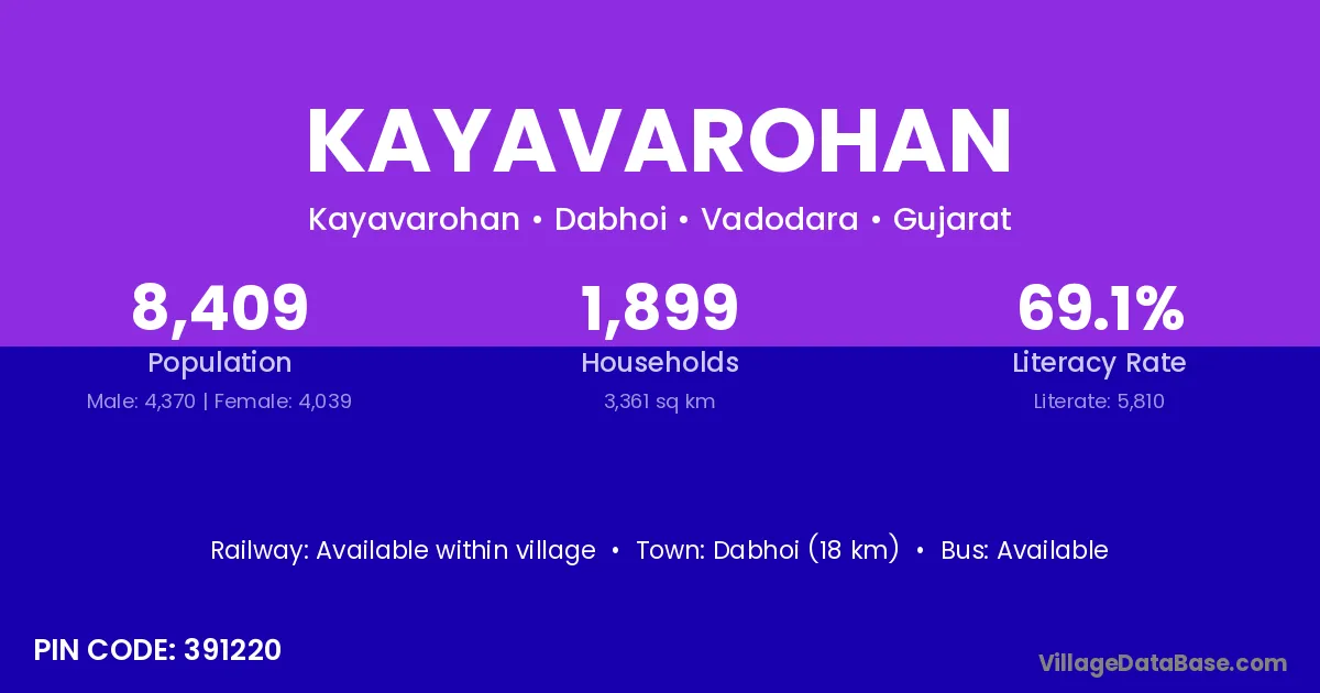 Dabhoi (18 km) is the nearest town to Kayavarohan village for major economic activities and is located approximately 18 km away.