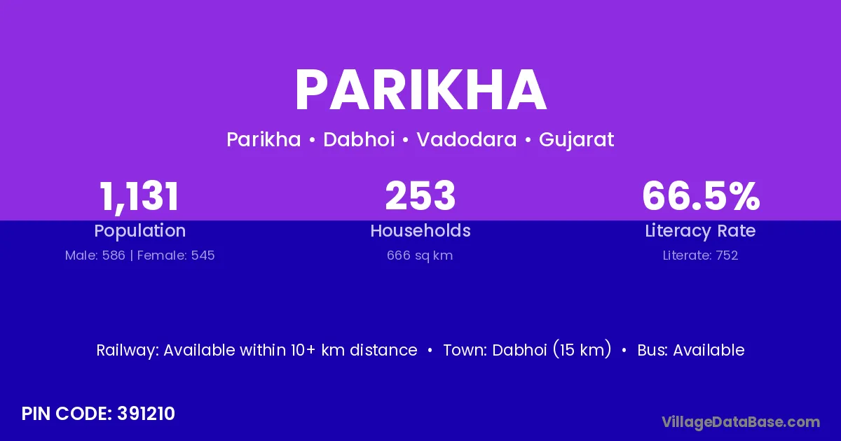 Dabhoi (15 km) is the nearest town to Parikha village for major economic activities and is located approximately 15 km away.