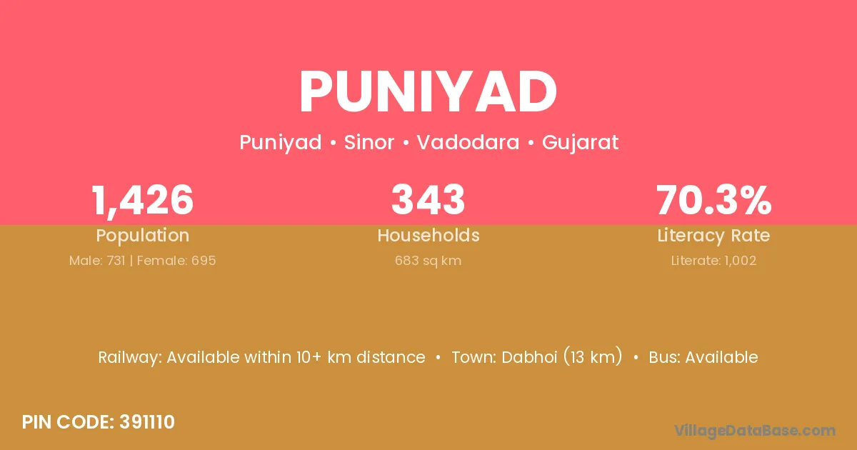 Karjan (13 km) is the nearest town to Puniyad village for major economic activities and is located approximately 13 km away.