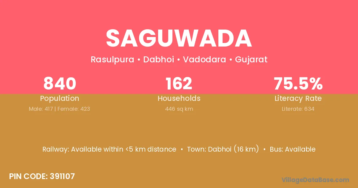 Dabhoi (16 km) is the nearest town to Saguwada village for major economic activities and is located approximately 16 km away.