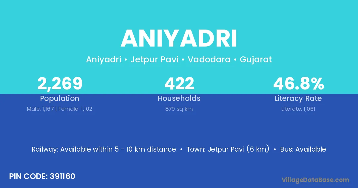 Jetpur Pavi (6 km) is the nearest town to Aniyadri village for major economic activities and is located approximately 6 km away.