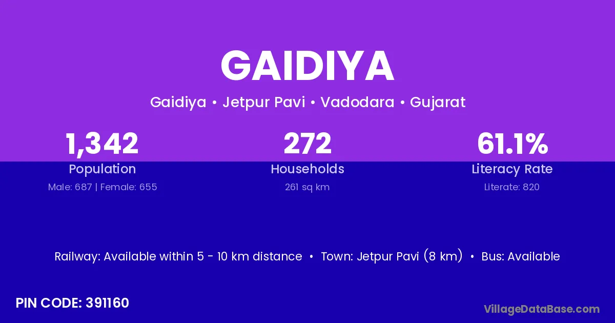 Jetpur Pavi (8 km) is the nearest town to Gaidiya village for major economic activities and is located approximately 8 km away.