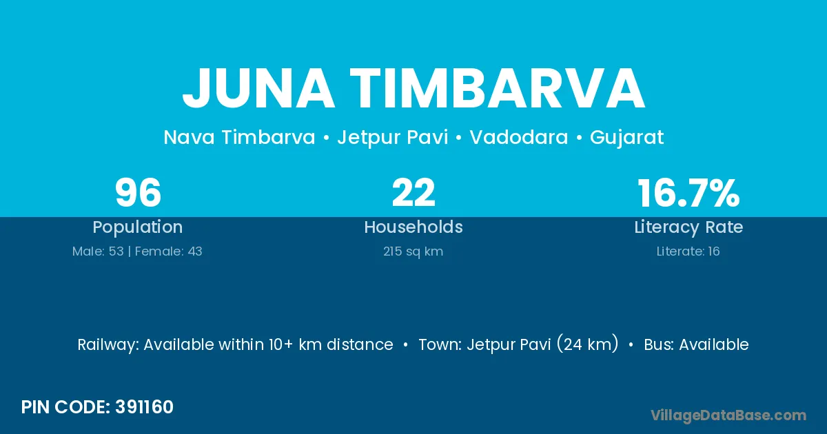 Jetpur Pavi (24 km) is the nearest town to Juna Timbarva village for major economic activities and is located approximately 24 km away.