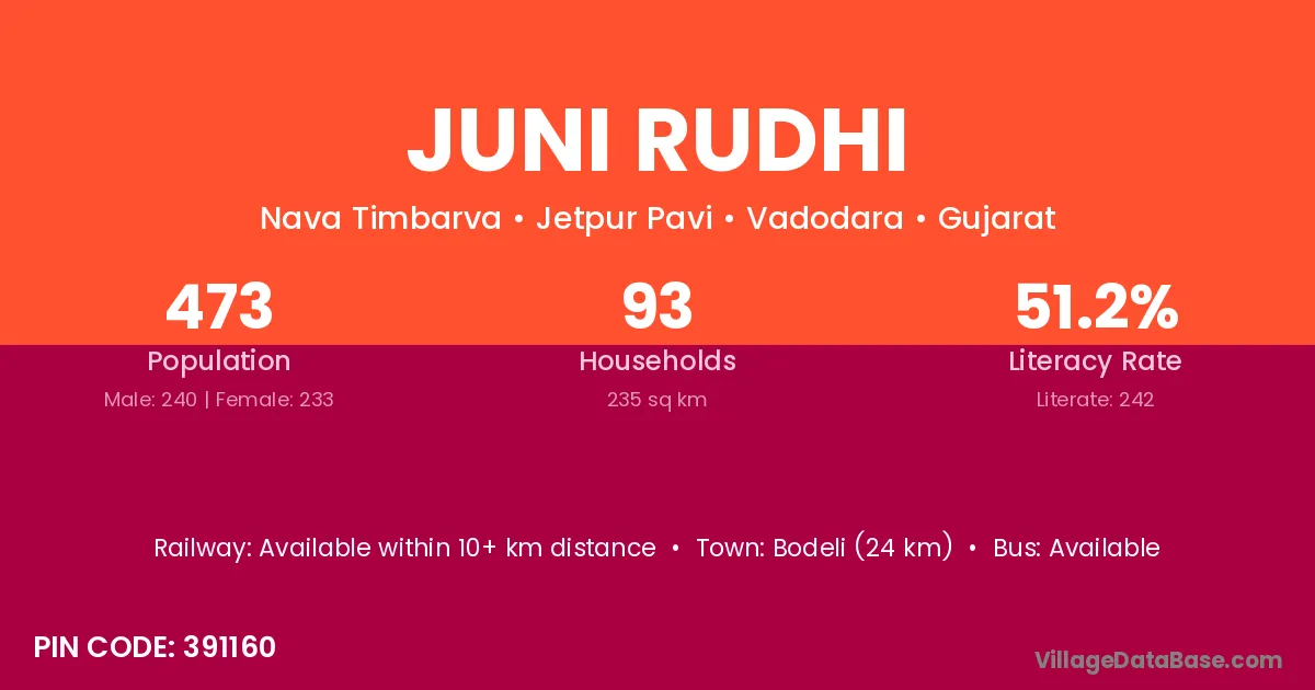 Bodeli (24 km) is the nearest town to Juni Rudhi village for major economic activities and is located approximately 24 km away.
