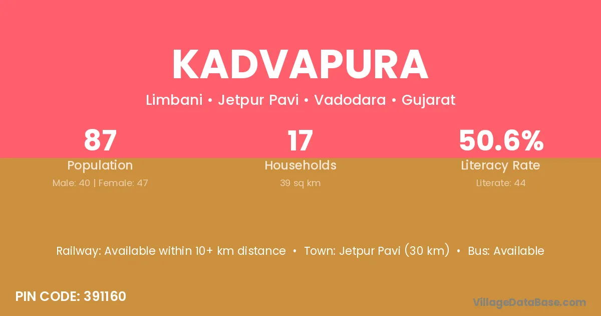 Jetpur Pavi (30 km) is the nearest town to Kadvapura village for major economic activities and is located approximately 30 km away.