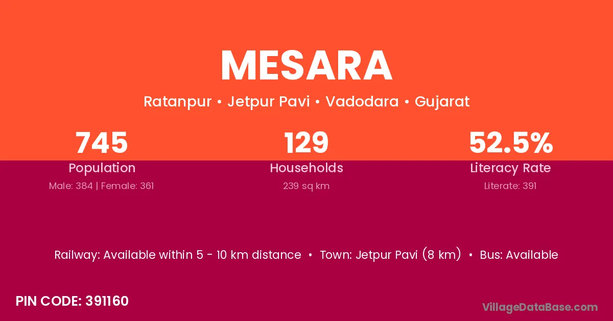 Jetpur Pavi (8 km) is the nearest town to Mesara village for major economic activities and is located approximately 8 km away.