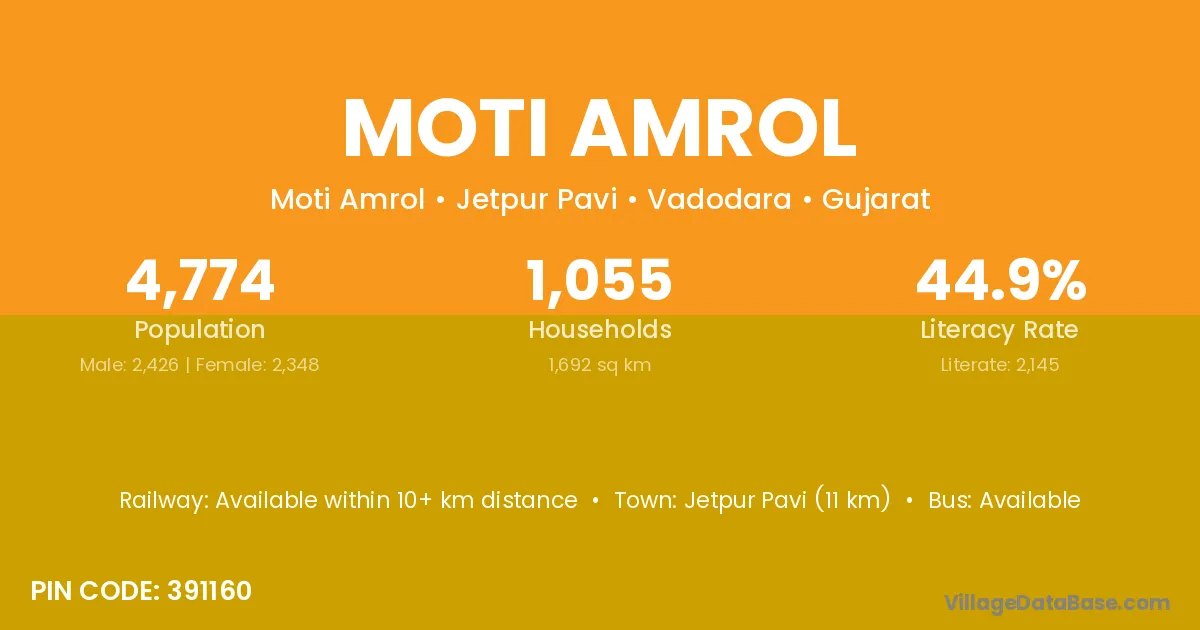 Jetpur Pavi (11 km) is the nearest town to Moti Amrol village for major economic activities and is located approximately 11 km away.