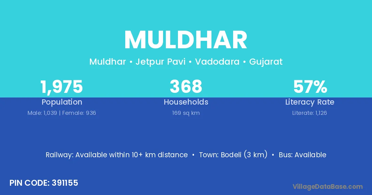 Bodeli (3 km) is the nearest town to Muldhar village for major economic activities and is located approximately 3 km away.