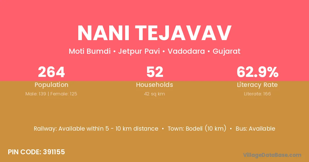 Bodeli (10 km) is the nearest town to Nani Tejavav village for major economic activities and is located approximately 10 km away.
