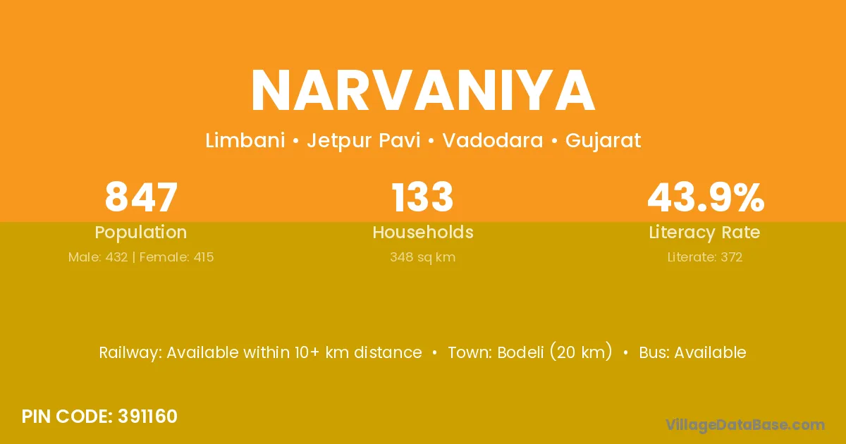 Bodeli (20 km) is the nearest town to Narvaniya village for major economic activities and is located approximately 20 km away.